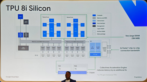 2025年に発表されたIronwoodでは、パッケージ上にダイは3つ搭載されていた。うち2つはTensorCoreのダイで、もう1つがスケールアップ時に使うチップ間インターコネクト(ICI)のダイになる。その意味で、TPU 8iはダイ構成は同じだ。TPU 8iはTensorCoreのダイが2つとICIという3つのダイ構成になっている。