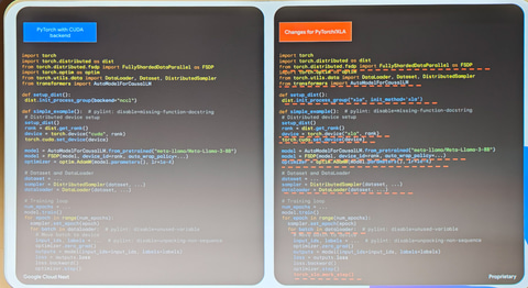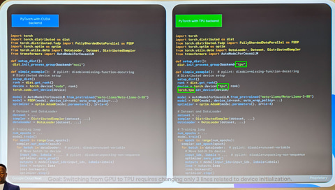 後者の場合はJAXなどがこれまで奨励されてきたが、PyTorchがTPUをネイティブサポートすると、CUDA+GPUからの乗り換えが容易になる。PyTorchのCUDA向けコードからTPU向けに書き換えるには多くの部分を修正する必要があり、かなりの大作業だったが、今回のPyTorchのネイティブサポートにより、わずか3行を書き換えるだけでこれが可能になるという。PyTorchを利用してAIのコードを書いているプログラマーにとってはよいニュースで、かつ、CUDA GPUからTPUへの移行もより容易になる。