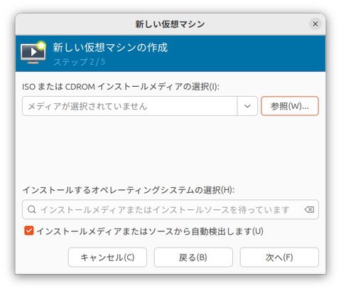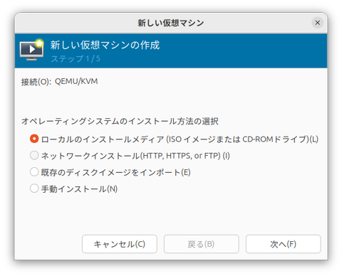 メニューから「ファイル」→「新しい仮想マシン」を選択する。すると以下のウィンドウが表示される。ここで「ローカルのインストールメディア」を選択して「次へ」をクリックする。