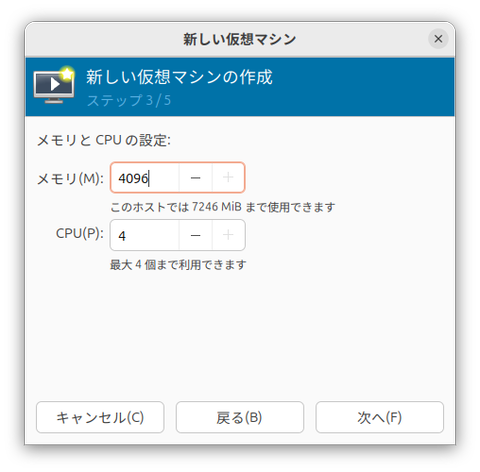 仮想マシンに割り当てるメモリとCPUコア数を設定する。ここは各自の要件に合わせた値を入力しよう。