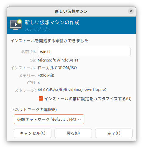 最後に仮想マシンに名前をつけよう。ここでは「win11」とした。重要なのが「インストールの前に設定をカスタマイズする」にチェックを入れることだ。すべての設定が完了したら「完了」をクリックしよう。