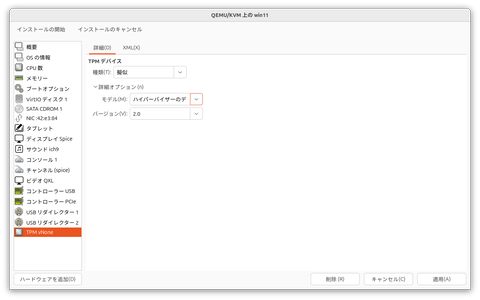 続いて「TPM vNone」をクリックする。「種類」を「疑似」とし、「モデル」は「ハイパーバイザーのデフォルト」、「バージョン」は「2.0」として「適用」しよう。