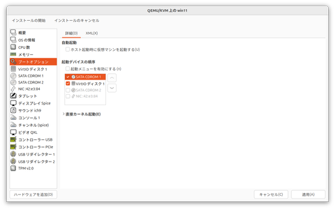 最後に「ブートオプション」を変更する。インストールメディアである「SATA CDROM1」にチェックを入れ、インストール先のストレージである「VirtIOディスク1」よりも上位にしておこう。これでISOイメージからインストーラが起動する。