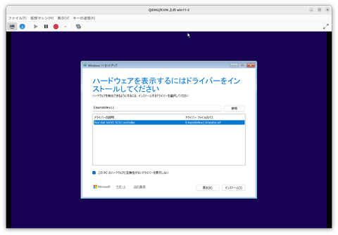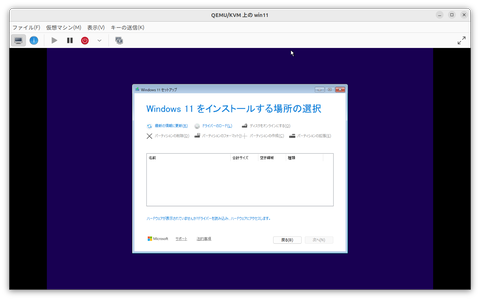 実機と異なるのが、前述のVirtIOの対応だ。繰り返しになるが、Windows 11のインストーラはVirtIOに対応していないため、インストール先を選択する画面で、存在するはずのストレージが検出できない。