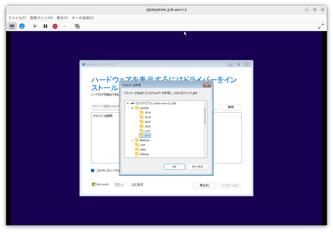 するとドライバのインストール画面が表示される。先ほど追加した仮想CD-ROMドライブから、VirtIOドライバを読み込もう。「参照」をクリックすると、フォルダーの参照ダイアログが開く。ここでドライバが含まれているフォルダを指定しよう。(おそらく)Eドライブの「amd64/w11」がそれだ。