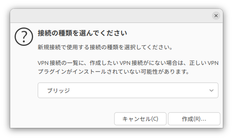 作成する接続の種類を聞かれるので、「ブリッジ」を選択して「作成」をクリックする。