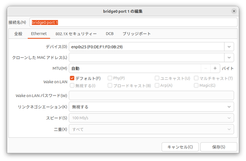 bridge0のポートの具体的な編集画面が開く。「デバイス」に有線LANのNICを選択して「保存」をクリックしよう。