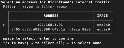 次に、クラスタ内で使用するネットワークに使うIPアドレスを選択する。インストール時にIPを振ったNICがリストアップされるので、カーソルキーの上下で使うIPアドレスにカーソルを合わせ、Spaceで選択しよう。すると文字が緑色に変化するので、その状態でEnterを押そう。