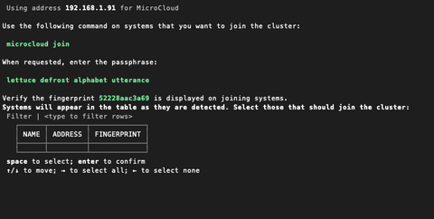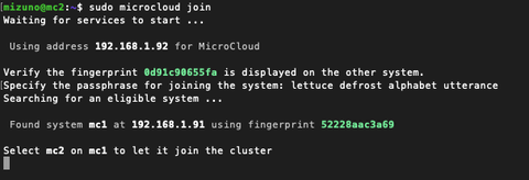 すると、クラスタ参加用のパスフレーズが緑色の文字で表示される。以下の例でいえば、「lettuce defrost~」というやつだ。これを控えておこう。