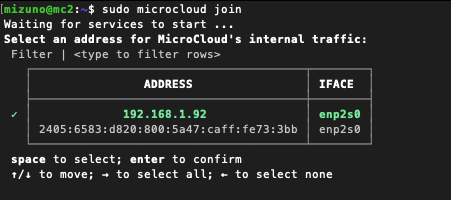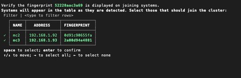 2号機、3号機でjoinコマンドを正しく実行できたら、先ほどから放置していた1号機の画面に戻ってこよう。以下のように1号機の画面に、2/3号機のIPアドレスとフィンガープリントが表示されているはずだ。IPアドレスを選択した時と同様に、2/3号機それぞれにカーソルを合わせ、Spaceで選択しよう。両方の文字が緑色になったことを確認したら、Enterを押す。