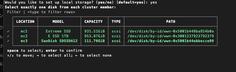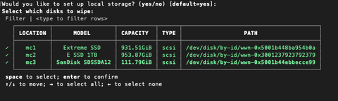 各PCに搭載されている、2つ目のストレージがリストアップされるはずだ。ここでもすべてを選択して、文字が緑色に変わったことを確認してEnterを押そう。