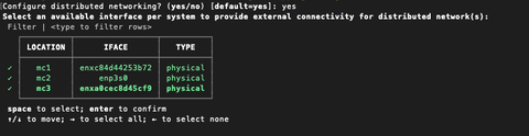 仮想ネットワークがアップリンクネットワークに接続するためのNICを選択しよう。IPアドレスを振ってない、2つ目のNICがそれぞれリストアップされるはずだ。これもすべてSpaceで選択してEnterを押そう。