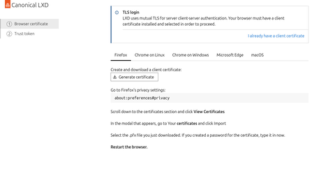 LXD-UIは、よくあるID/パスワードではなく、クライアント証明書を使って認証を行なう。少し手間ではあるのだが、以下のスクリーンショットの手順で操作すればよい。なおここでは、WebブラウザはUbuntu標準のFirefoxを使っているものとする。