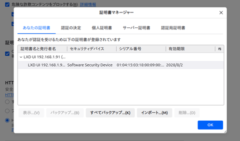 すると「lxd-ui-サーバーのIPアドレス.pfx」という名前のファイルがダウンロードされる。これをFirefoxに追加しよう。Firefoxのアドレスバーに「about:preferences#privacy」と入力すると、設定画面が開く。「証明書」セクションにある「証明書を表示」をクリックしよう。