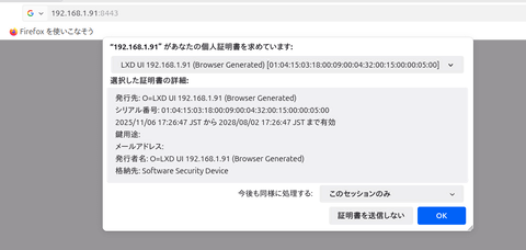 もう一度LXD-UIのURLにアクセスすると、クライアント証明書の提示を求められる。先ほどインポートした証明書を選択して「OK」をクリックしよう。これでLXD-UIへのログインは完了だ。