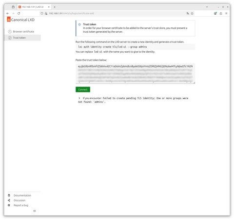 LXD-UIの画面に戻り、テキストボックスにトークンをコピペして「Connect」をクリックする。