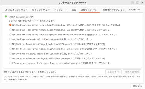NVIDIAのビデオカードを使用するということはプロプライエタリなドライバをインストールする必要があるということで、「追加のドライバー」を起動して、執筆時点で最新版の「nvidia-driver-580-open」を選択して「変更の適用」をクリックする。