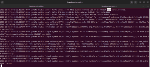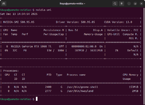 「nvidia-driver-580」だとうまく動作しないことが分かっている。というのも、nvidia-driver-580をインストールした上でログを見ると、「NVRM installed in this system requires use of the NVIDIA open kernel modules.」とある。少なくともGeForce RTX 50シリーズでは(40シリーズは不所持ゆえ未確認)open kernel modules、すなわち「nvidia-driver-580-open」である必要があるということだ。