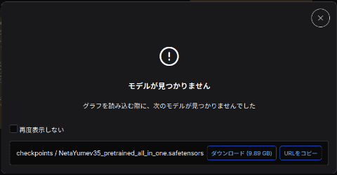 「NetaYume Lumina」をクリックすると、モデルがない旨が表示されるので、指示通りダウンロードし、所定のフォルダに置く。
