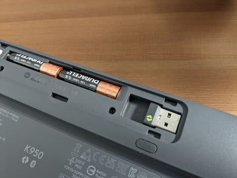 また、本製品の接続はBluetoothだけでなくUSBレシーバによる無線接続も可能なLogi Boltもサポートする。筆者はBluetooth接続で遅延も感じていないため現状使用していないが、Bluetoothが使えない環境などでは便利だろう。なお、Logi Boltレシーバは電池ボックス横に格納できるので、持ち運び時や収納時の紛失を防げそうだ。