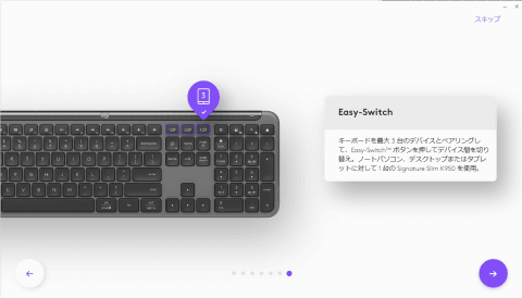 ソフトウェア面については、「Easy-Switch」ボタンをまず語るべきであろう。これは最大3台のデバイスと接続でき、ワンタッチで素早く切り替えできるロジクール独自の機能だ。Easy-Switchを使えば、複数のPCのキーボードをK950に集約可能となる。