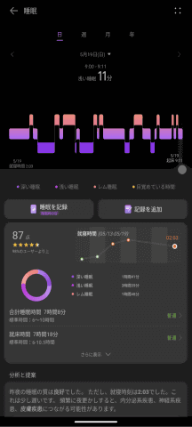睡眠時に特に操作することなく、ただ装着するだけで睡眠時のデータを自動で細かく計測してくれるので、生活リズムの把握などに非常に便利である。また、筆者はよく寝落ちしていつから寝ていたのか分からなくなるのだが、Band 9があればどのタイミングで何時間寝ていたのか確認できるのでとても助かっている。