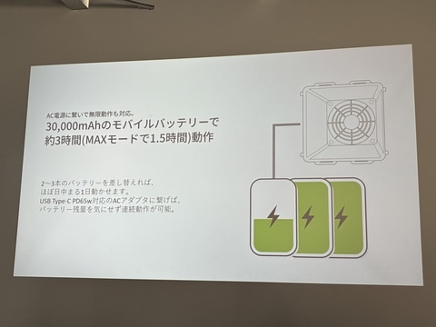 バッテリ駆動時間については、30,000mAhのモバイルバッテリ使用時、ECOモードで約3時間、MAXモードで約1.5時間動作させられるとのこと。どのぐらい屋外で活動するかにもよるが、モバイルバッテリを2~3本用意する必要があるだろう。