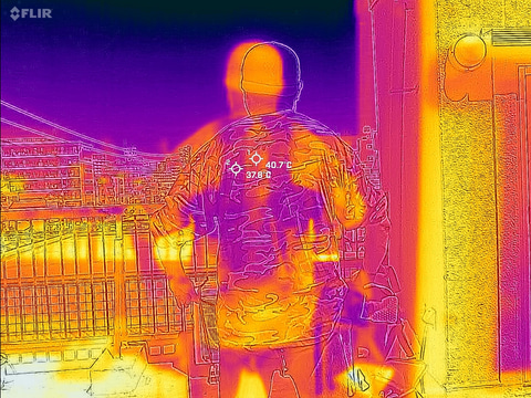 「ChillerX」装着前後で額の温度はそれほど変わらなかったが、背中やや左は1.7℃、背中中央は7.9℃もの差が生じた。体感的にはもっと大きな差を感じており、「ChillerX」未装着時は10分間テントの中にいるのが結構辛かったし、顔にも汗をかいていた。しかし、「ChillerX」装着時はほとんど疲労を感じることはなく、一緒にテントに入っている人と会話する余裕すらあった。