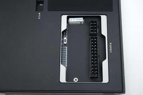 使い方はほぼ見ての通り、接続できるコネクタやポートに対応デバイスやケーブルを接続していくだけ……なのだが、注意したいのは、Thunderbolt 5とOCuLinkの切替スイッチが、ATX24ピンおよびEPS 8ピンコネクタの周りのマグネット式の蓋を取った下に隠されている点。デフォルトではOCuLinkが選択されているため、Thunderbolt 5で使いたい場合は、あらかじめスイッチで切り替えておかないと認識されない(筆者はハマった)。