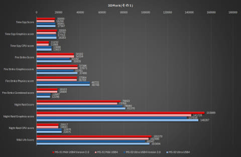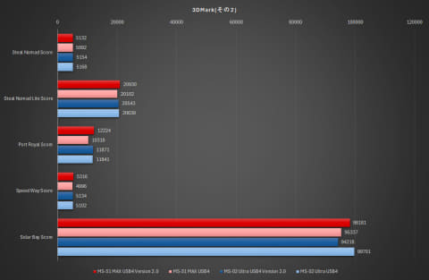 ただ、実際の3DMarkにおいてグラフィックス性能を測る各種ベンチマークでは、USB4とUSB4 Version 2.0の間で大きなスコア差がなかった。MS-S1 MAXではUSB4 Version 2.0の優位性が見られたが、MS-02 Ultraでは逆転するなどしている。いったんジオメトリやテクスチャデータがVRAMに乗ってしまえばGPUがすべてを処理するので、ある意味納得できる結果だ。よって、ユーザーが実際に影響を受けそうなのは、LLMでモデルをGPUにロードする時の転送時間程度かもしれない。