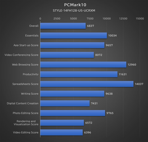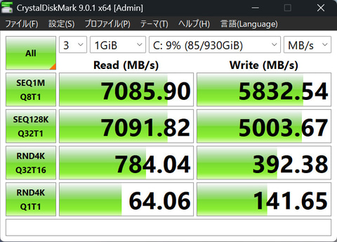 メモリは16GB(LPDDR5Xー7500)で、直販サイトのカスタマイズモデルでは最大32GBまで拡張できる。ストレージは1TBのNVMe SSD(PCIe 4.0 x4接続)となっており、512GBも選択可。アクセス速度は下記CrystalDiskMarkのスコアで分かる通りシーケンシャルリード7,000MB/s超えとかなり高速だ。