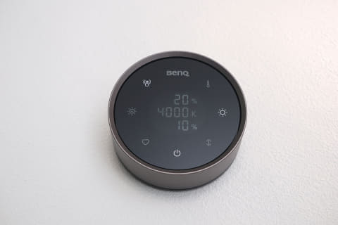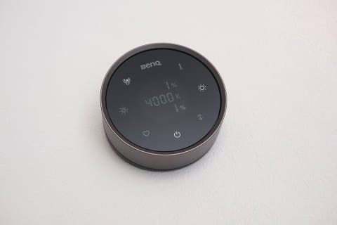 ScreenBar Halo 2に付属する円形のリモコンは、なんと無線式。手のひらにすっぽり収まるサイズ感ながら、電源のオン/オフはもちろん、色温度と輝度の微調整、前面ライトと背面ライトそれぞれの点灯/消灯、自動輝度調整、人感センサーのオン/オフ、そしてお気に入りの設定(1つだけ)までをすべてタッチ式で操作できる。