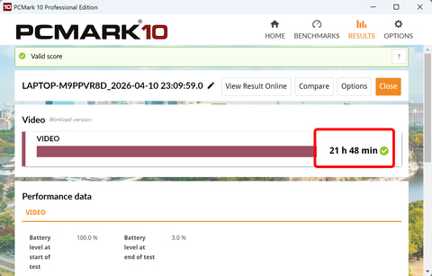 キーボード上部で41.2℃、中央で38.4℃と触ってもほんのりと温かいレベルだった。低発熱のCPUといってよいだろう。そして、動作音は正面33.6dB、左側面34.8dB、背面34.1dBとわずかにファンの音が聞こえるレベルと非常に静かだ。負荷の高いゲームプレイでこの静かさなので、多くの作業で動作音が気になることはないだろう。最後にバッテリ駆動のテストだ。PCMark 10 Video Battery Lifeを実行している。画面の輝度は50%、バッテリが100%の状態から電源が切れるまでを測定した。