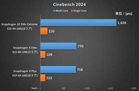 といったところで、実際にどこまで性能が向上しているのか前世代の上位モデルとなる12コアの「Snapdragon X Elite X1E-80-100」、10コアの「Snapdragon X Plus X1P-64-100」を交えてどこまで性能が異なるのかチェックしてみよう。