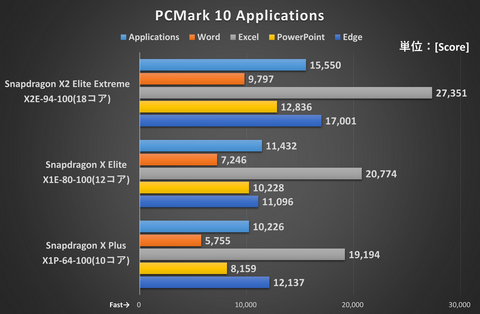 Cinebench 2024は前世代のSnapdragon X Elite X1E-80-100から6コア増えたSnapdragon X2 Elite Extreme X2E-94-100だが、Multi Coreのスコアは2倍以上もアップしている。コアあたりの性能も向上しているためだろう。それは Single Coreのスコアが高いことからも分かる。PCMark 10 Applicationsもすべてのアプリでスコアが向上。特にExcelで強さを見せた。オフィスワークの快適度はかなりアップした。