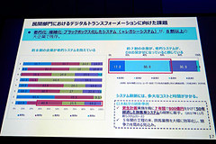 民間分野でのデジタルトランスフォーメーションに向けた課題として、IT関連費用の8割が現行システムの保守にかけられていることを示しつつ、情報資産の現状を分析・評価し、仕分けを実施しながら、戦略的にシステム刷新を推進することが重要として、今後、秋に向けて法整備を進める考えを示した。