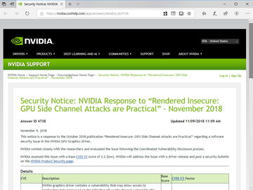 研究グループは、すでに本件についてNVIDIAに報告しており、同社はシステム管理者に対して、ユーザーレベルのプロセスからのパフォーマンスカウンタへのアクセスを無効にするオプションを提供するパッチを公開する予定であるという。また、AMDおよびIntelのセキュリティチームとも情報を共有している。