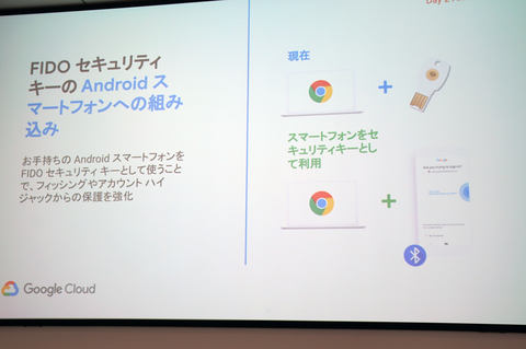 佐藤氏は、AndroidスマートフォンをFIDO(Fast IDentity Online)でのセキュリティキーとして利用できることも注目を集めた話題として説明。Androidスマートフォンで使用できる2要素認証としては、数字の組み合わせをキーとして使うものがあるが、この機能ではBluetoothによって端末そのものをキーとして利用できるため、数字の入力などは不要となっている。