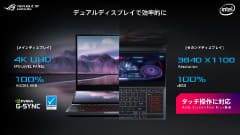 3,840×2,160ドット(4K)表示対応の15.6型メインディスプレイに加え、キーボード奥に3,840×1,100ドット表示/タッチ対応のセカンドディスプレイ「ROG ScreenPad Plus」を搭載するのが特徴。
