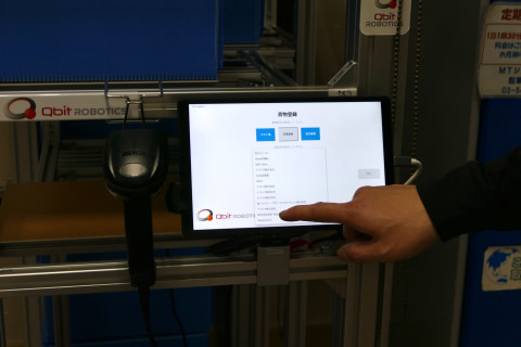 Universal Robotsの協働ロボットアーム「UR5e」にOnRobotのバキュームグリッパーとビジョンシステムを組み合わせた「ロボットアーム搭載荷物棚」はQBITの独自開発。マーカーとビジョンを使うことで、自動搬送ロボットの停止位置ズレに対しても荷物の積込み/荷下ろしができる。専用ケースに入らない荷物は現在は扱うことはできない。