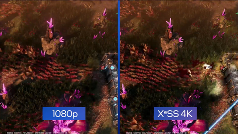 このXeSSもゲームでの対応が必要となるわけだが、基調講演でその最初の例として「The Riftbreaker」がAlchemist上で動作するデモがなされた(利用されたのはベータデモのリビジョン22335)。大量の3Dオブジェクトが、XeSSにより、1080pより精細な4K解像度で描画されながらも、スムーズに動作していることが確認できる。