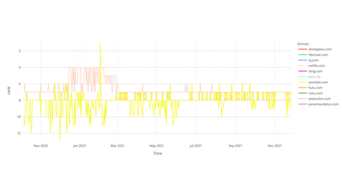 ビデオストリーミングサービスは、2022年から変わらずNetflix.comが1位、YouTube.comが2位、Roku.comが3位を獲得。Netflix.comは週末にトラフィックが伸びる傾向があり、ネットワーク全体から見た順位ほぼ7位、最高順位は2021年初に4位まで到達した。