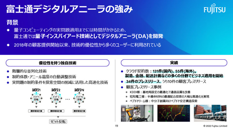 富士通では、量子コンピュータの実問題の適用までには時間がかかることから、量子インスパイアード技術によって最適化問題に特化できるデジタルアニーラを開発。2018年から顧客に提供を開始し、クラウド契約数では国内131件、海外55件が採用。「製造、金融、配送計画などの多くの分野でビジネス適用を開始している」という。