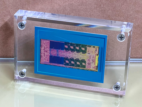 その箱を開けると、再びダイレイアウトの写真があしらわれており、その中のふたを開けると左側にはそのダイ写真を封入した記念品が入っている。裏面には、現状発表されている通称K SKUと呼ばれるアンロック版第13世代CoreのSKU構成とそのスペックが書かれている。