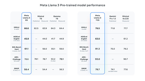 Meta AIで採用されているLlama 3は、上述の通り同日付けで同社が発表した最新のLLM。8B(80億)および70B(700億)パラメータのモデルを公開しており、今後は400B(4,000億)以上のパラメータを持つモデルも計画しているという。