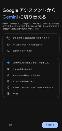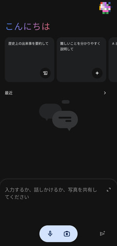アプリ版でも、Web版と同様のインターフェイスを通じてGeminiとのやりとりが行なえる。なおAndroidでは、Googleアシスタントと切り替えるかたちでGeminiが有効になる仕様となっている(Googleアシスタントに戻すことも可能)。