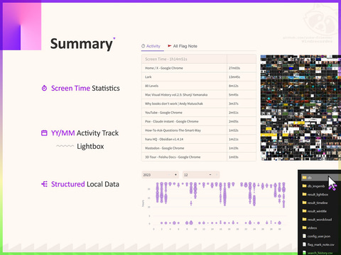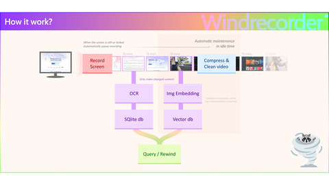 仕組みとしては、ffmpegを使ってPCの画面を15分程度のフラグメントファイルとして録画していくとともに、この録画に対し、Windows標準のOCR APIによる文字認識や画像埋め込みを行なってインデックスを作成する。記録された映像や情報はWeb UIを通じて確認でき、後から振り返ったり、ウィンドウ名など関連するテキストで検索したりできる。あわせてスクリーンタイムなどの統計情報についても提供する。特定のプログラムや画面上の範囲を記録の対象外にすることも可能で、データの保管や処理はすべてローカルで行なわれる。