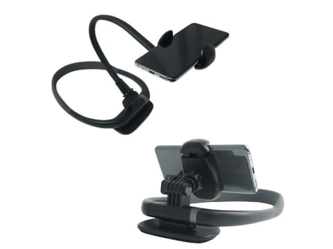 ネックバンドを首にかけ、アーム部が自由に曲げられ、好きな位置に固定できるスマートフォンホルダー。ネックバンド下部裏側に安定性を保つスタビライザーパッドを搭載。首、肩、胸の3点で固定できる。手ぶらで撮影したい、いつでもスマホが見たいユーザーに好適という。また、机の上でもスタンドとして使える。