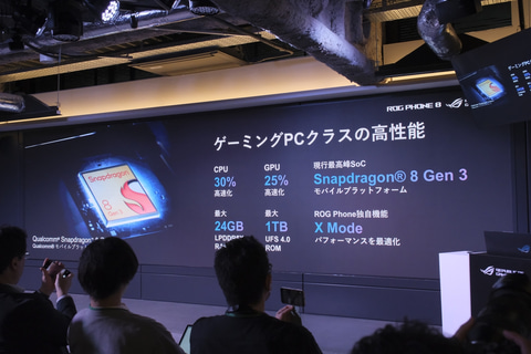 全モデル共通で、SoCにSnapdragon 8 Gen 3を搭載し、従来からCPU性能を30%、GPU性能を25%高速化。最上位のROG Phone 8 Pro Editionではメモリが24GB LPDDR5X、ストレージが1TB UFS 4.0と、スマホとして異例と言えるほど大容量なものを搭載。それ以外のモデルでも、メモリは共通で16GB LPDDR5X、ストレージは512GB(ROG Phone 8 Pro)または256GB(ROG Phone 8)のUFS 4.0を搭載しており、フラグシップ機らしい仕様となっている。