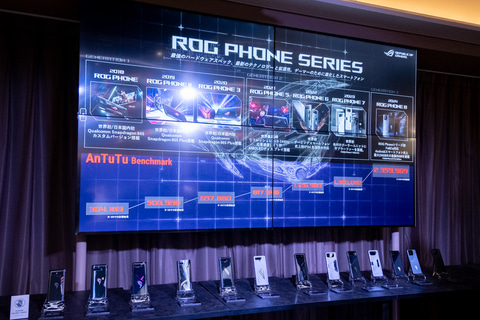 そのほか、報道関係者向けの製品説明会では、ROG Phone 8シリーズをはじめとしたスマートフォンに装着して使える外付けコントローラ「ROG Tessen Mobile Controller」や、歴代のROG Phoneシリーズの展示も行なわれていた。